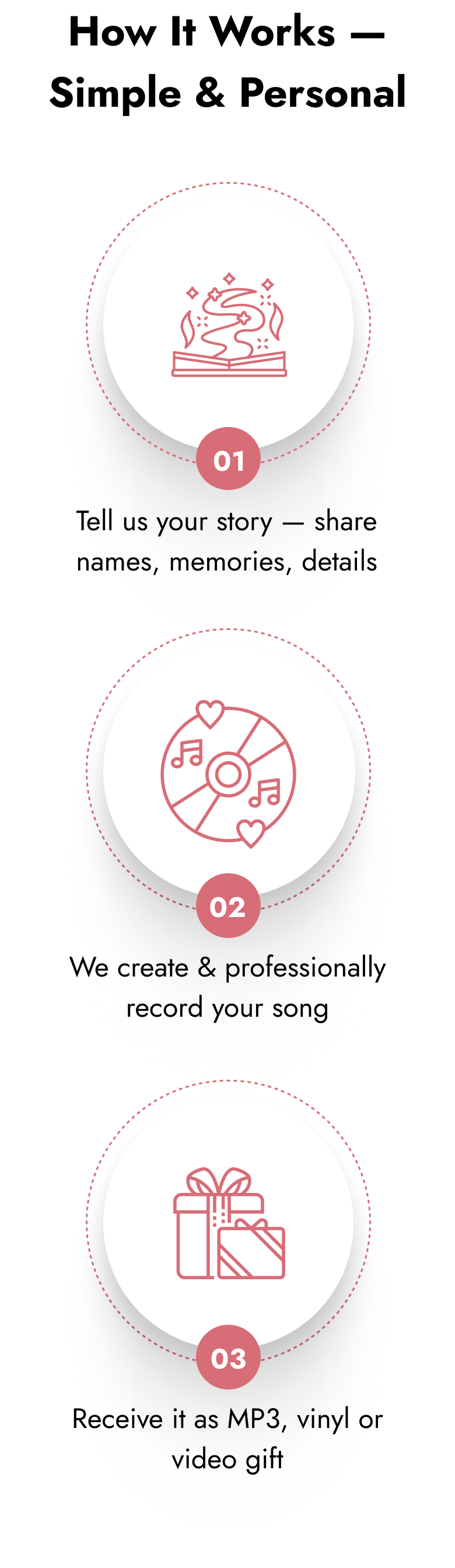 Of course! Upload your favorite photos, and we’ll turn your song into a personalized video — the perfect way to bring your story to life.